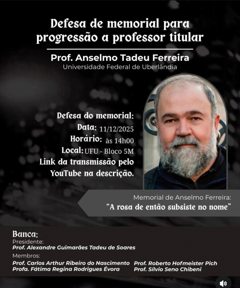 O Instituto de Filosofia da Universidade Federal de Uberlândia tem a honra de convidar a Comunidade Universitária para a Apresentação e Defesa Pública de Memorial como parte dos requisitos para a Promoção da Classe de Professor Associado IV para a Classe de Professor Titular na Carreira do Magistério Superior, nos termos da Resolução 03/2017 do Conselho Diretor da Universidade Federal de Uberlândia, conforme abaixo:
